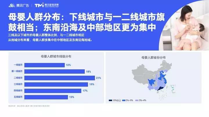從城市分布來(lái)看,在三線(xiàn)及以下城市的母嬰人群占比與一二線(xiàn)城市相近,各占一半左右,且多集中在中部地區(qū)及東南沿海等區(qū)域。