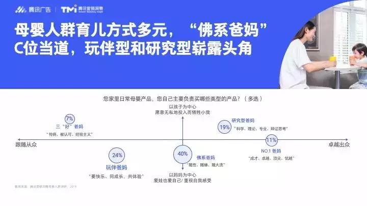其中佛系占比最高(40%),玩伴(24%)和研究型(19%)也比較多見(jiàn),保守傳統(tǒng)型的三“好”爸媽反而占比最少(7%),從一個(gè)側(cè)面反映出年輕一代育兒觀(guān)念、家庭模式的變化。