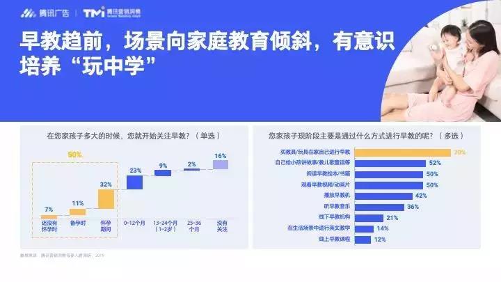 除了基本“保育”,“教育”也是母嬰人群關(guān)注的焦點(diǎn)。洞察顯示,50%的家長(zhǎng)在孩子出生前就已經(jīng)在關(guān)注早教知識(shí),不能讓孩子輸在起跑線(xiàn)上成為家長(zhǎng)共同的焦慮。同時(shí),在調(diào)查中70%的父母都選擇了在家進(jìn)行早教,早教場(chǎng)景明顯向家庭教育傾斜,父母?jìng)冇幸庾R(shí)培養(yǎng)孩子“玩中學(xué)”。