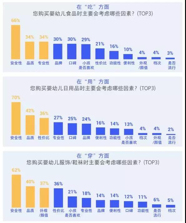 數(shù)據(jù)顯示,消費(fèi)者在選購(gòu)母嬰產(chǎn)品時(shí)的各類(lèi)考慮因素中,安全性和品質(zhì)最受重視,占比分別超過(guò)60%,其中購(gòu)買(mǎi)嬰幼兒食品注重安全性因素高達(dá)66%,是否流行因素最低僅有3%。