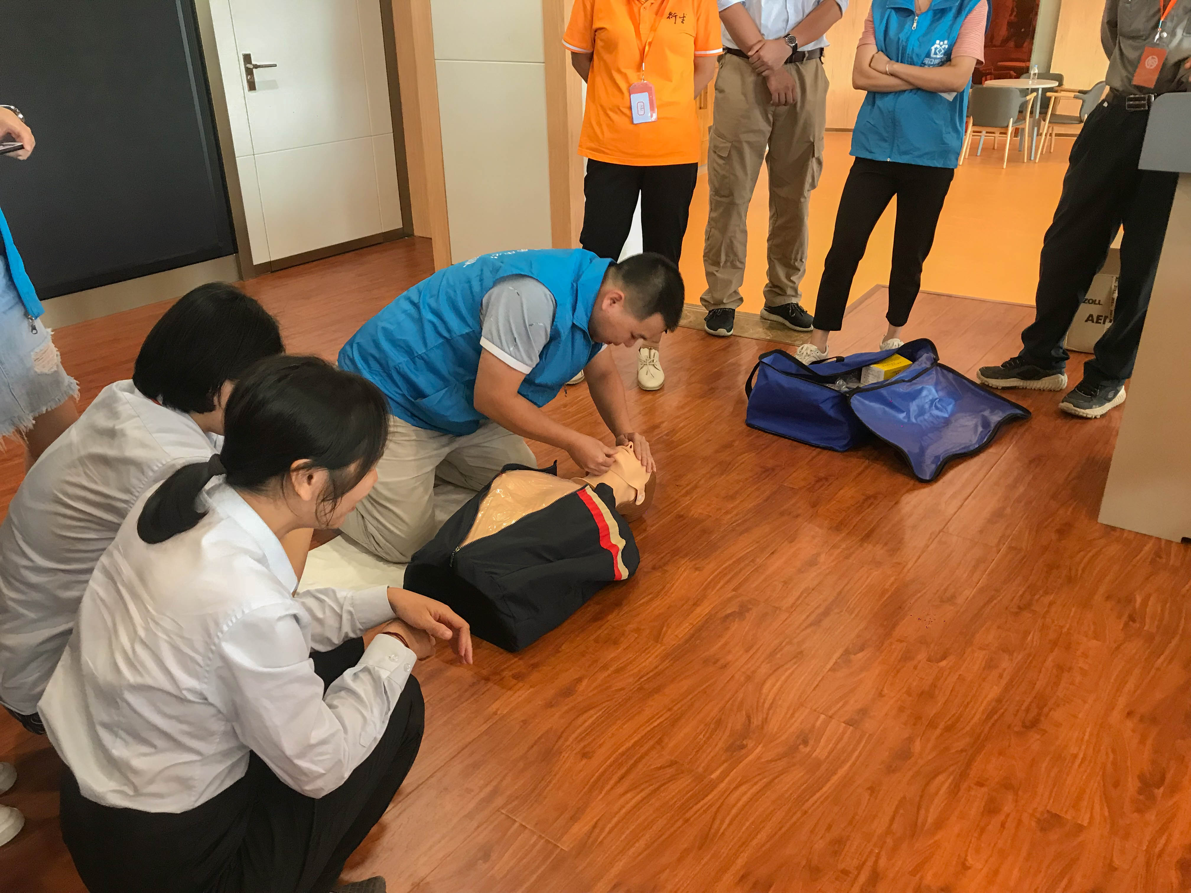 衛(wèi)生院專業(yè)人士以先理論、后實操的方式,生動形象地向參培人員講解了現(xiàn)場救護(hù)的重要性、中暑急救知識、創(chuàng)傷現(xiàn)場急救知識,重點講解了如遇需急救人員時如何正確對其進(jìn)行心肺復(fù)蘇和胸外按壓,并在現(xiàn)場演示了步驟和姿勢。